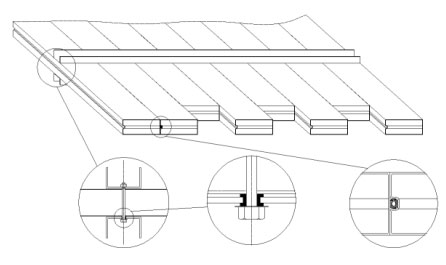 全接液磚式結(jié)構(gòu)鋁合金內(nèi)浮盤是在裝配式內(nèi)浮盤的基礎(chǔ)上,通過改變裝配式浮頂水平平行布筒方式,增加為全浮筒式內(nèi)浮盤,全浮筒式、全接液磚式的出現(xiàn)是一種新型的浮盤。該結(jié)構(gòu)形式提高了內(nèi)浮頂?shù)恼w結(jié)構(gòu)強度和浮盤運行的穩(wěn)定性。同時浮力元件相互鑲嵌,既有產(chǎn)生浮力的作用,又起到浮頂骨架支梁的作用,更進一步增強了浮頂?shù)恼w結(jié)構(gòu)強度,防止塌盤。