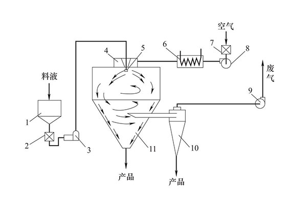 1—料液貯罐;2—料液過濾器;3—送料泵;4—熱風(fēng)分布器;5—霧化器;6—空氣加熱器;7—空氣過濾器;8—鼓風(fēng)機(jī);9—引風(fēng)機(jī);10—旋風(fēng)分離器;11—噴霧干燥器