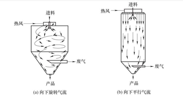 空氣經(jīng)過濾和加熱,進入噴霧干燥機頂部空氣分配器,熱空氣呈螺旋狀平均地進入干燥室。料液經(jīng)塔體頂部的高速離心霧化器,(旋轉(zhuǎn))噴霧成極細微的霧狀液珠,與熱空氣并流接觸在極短的時間內(nèi)可干燥為廢品。廢品連續(xù)地由干燥塔底部和旋風別離器中輸出,廢氣由引風機排空。