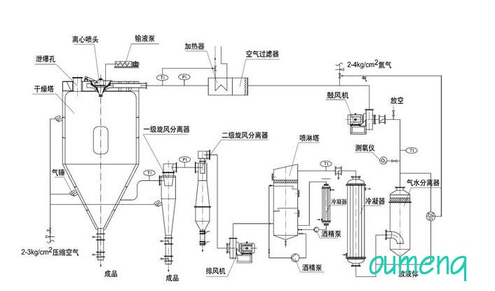 閉式循環(huán)噴霧干燥機系統(tǒng)由噴霧干燥機主機、帶空氣過濾器的加熱器、鼓風機、水氣分離器、大小冷卻塔、噴淋塔、排風機、一級旋風分離器、二級旋風分離器、泵、測氧儀以及管路與控制閥等組成。